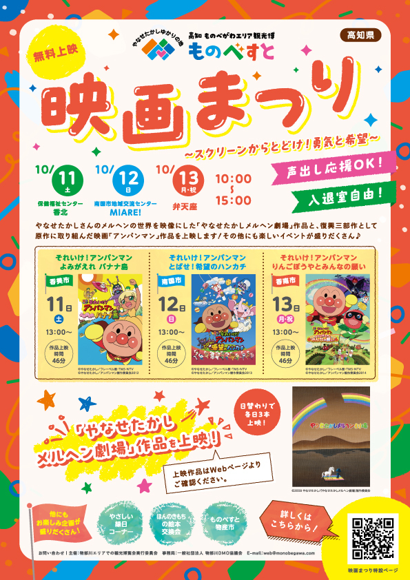 やなせたかしさんのメルヘンの世界を映像にした「やなせたかしメルヘン劇場」作品と、復興三部作として原作に取り組んだ映画「アンパンマン」作品を上映します!その他にも楽しいイベントが盛り沢山♪