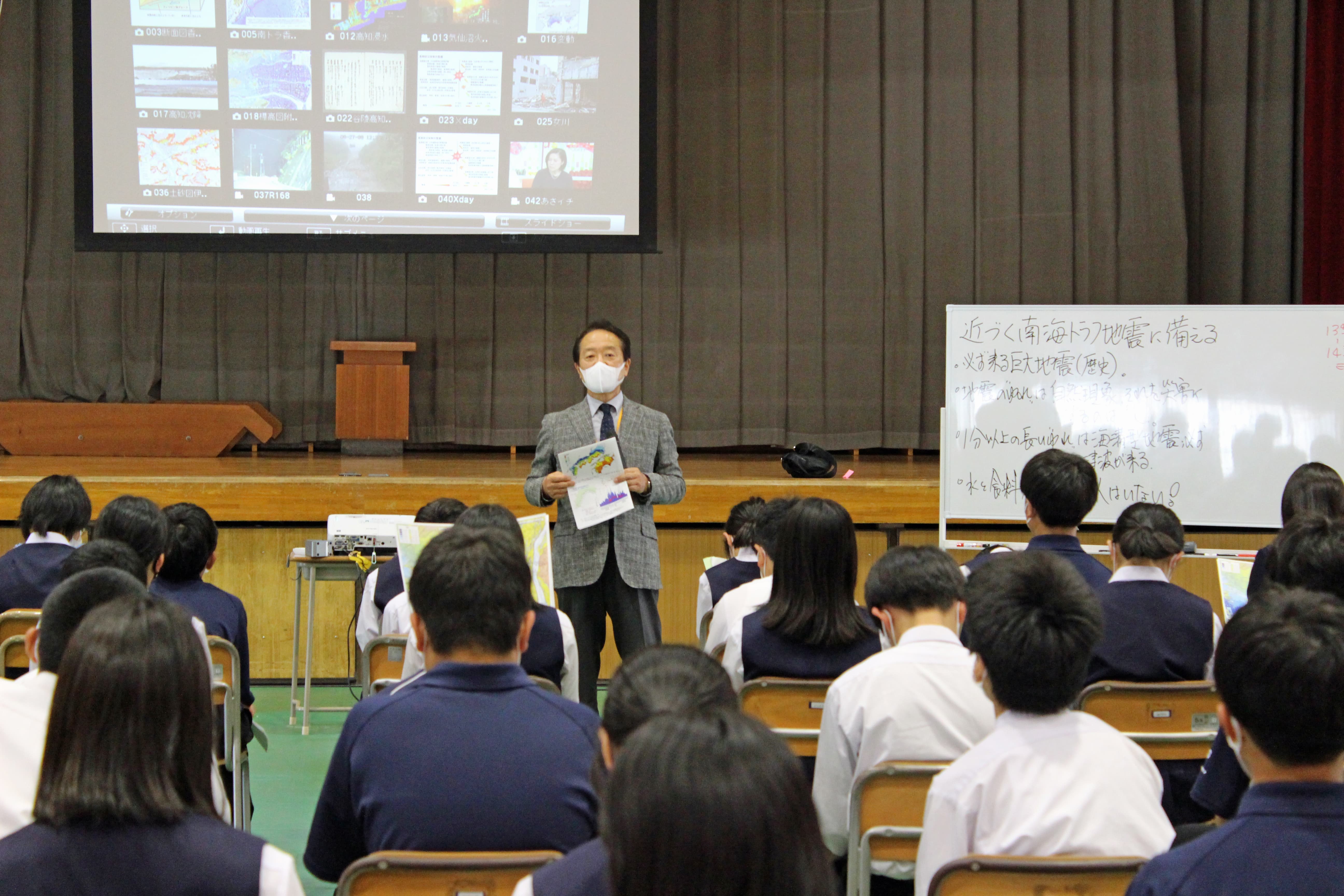 生徒の皆さんも、南海トラフ巨大地震にどう備えるか考えながら真剣に聞いていました。