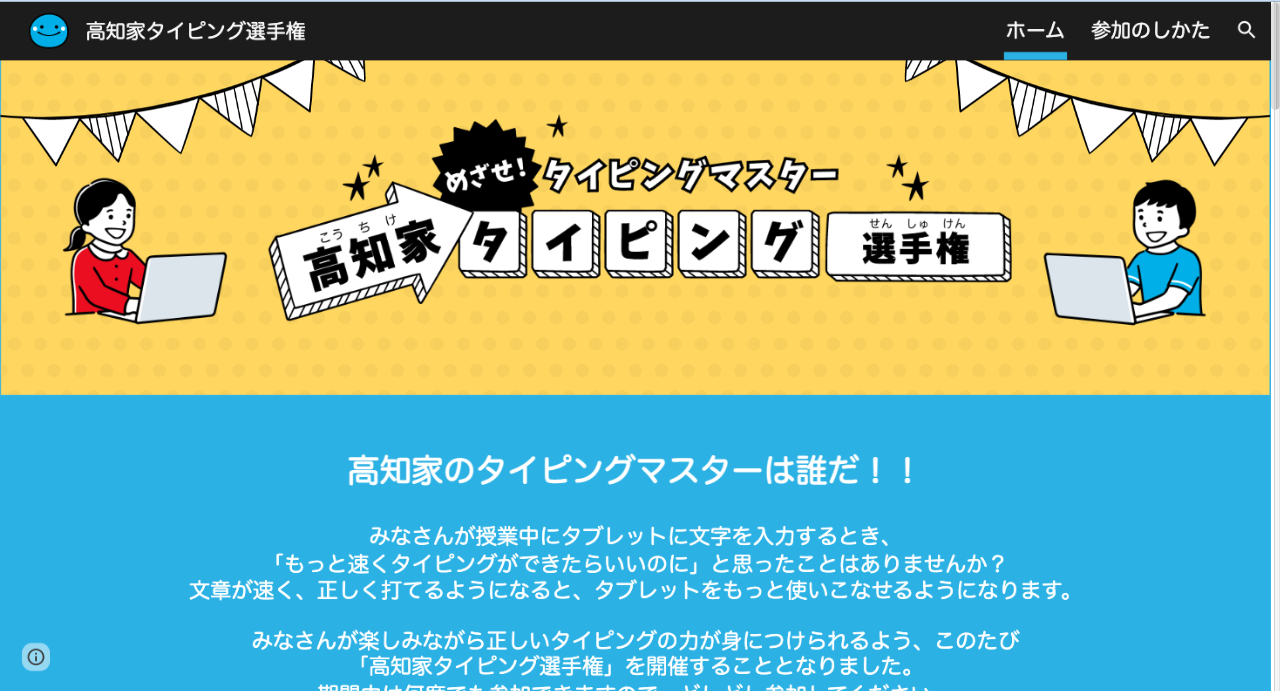 高知家タイピング選手権が開催されています。第1回は12月23日(金)までです。小学生・中学生・高校生・教職員保護者の各部門があります。何回でも挑戦できます。