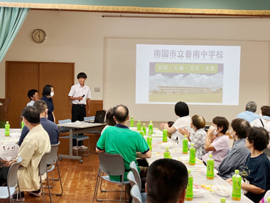 岩村地区の防災訓練で、中学生の代表が防災啓発を行いました。これまでの総合的な学習の時間や防災士養成講座で学んだことを活かして分かりやすくプレゼンができていました。