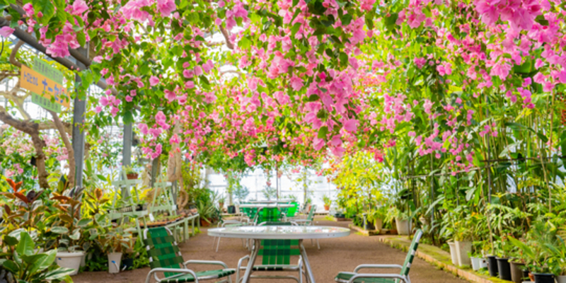 600坪の広さを誇るトロピカルナーセリーでは、約200種類の亜熱帯植物が迎えてくれ、なかでも天井に広がる美しい「ブーゲンビレア」は日本一の規模を誇ります。