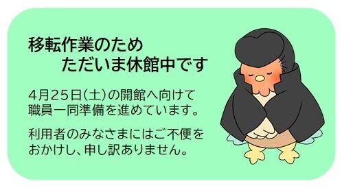 利用者のみなさまにはご不便をおかけしますが、4月25日(土)の開館へ向けて準備を進めていきますので、今しばらくお待ちください。