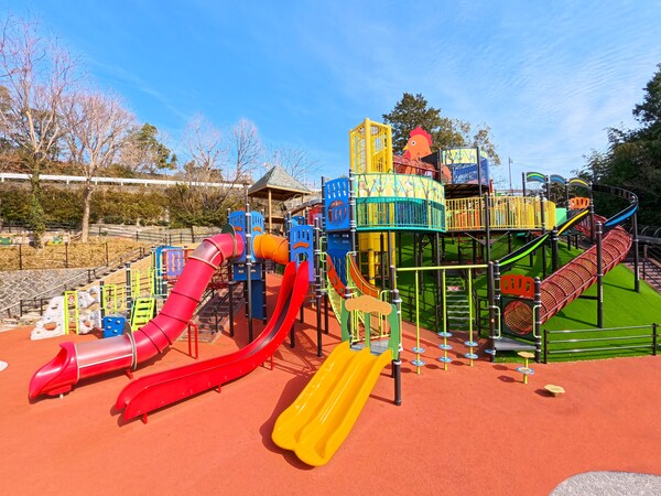 2020年12月にリニューアルオープンした子どもの広場は年齢に応じたエリアに分かれています。最上段には0~3歳向けの「すくすくランド」、中段には3~6歳向けの複合遊具、中段から下段にかけては斜面を利用してダイナミックに遊べる6~12歳向けの大型複合遊具が設置されています。中段と下段の地面はカラフルで弾力のあるゴムチップ舗装を行い、雨が降った後でも水たまりができにくく、安全に楽しく遊んでいただける広場となりました。また、急な斜面(法面)には安全柵を設置し、新たに芝を植えることで周囲の自然環境との調和を図りました。