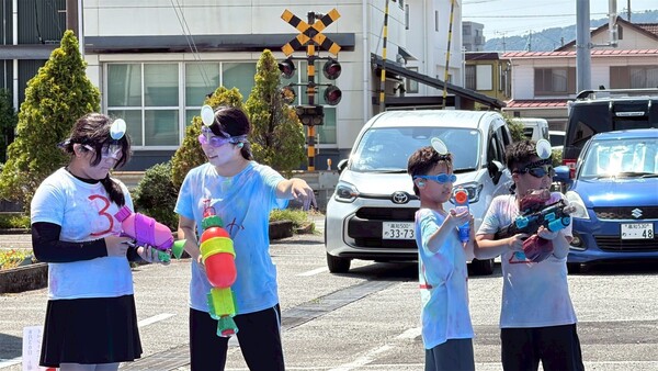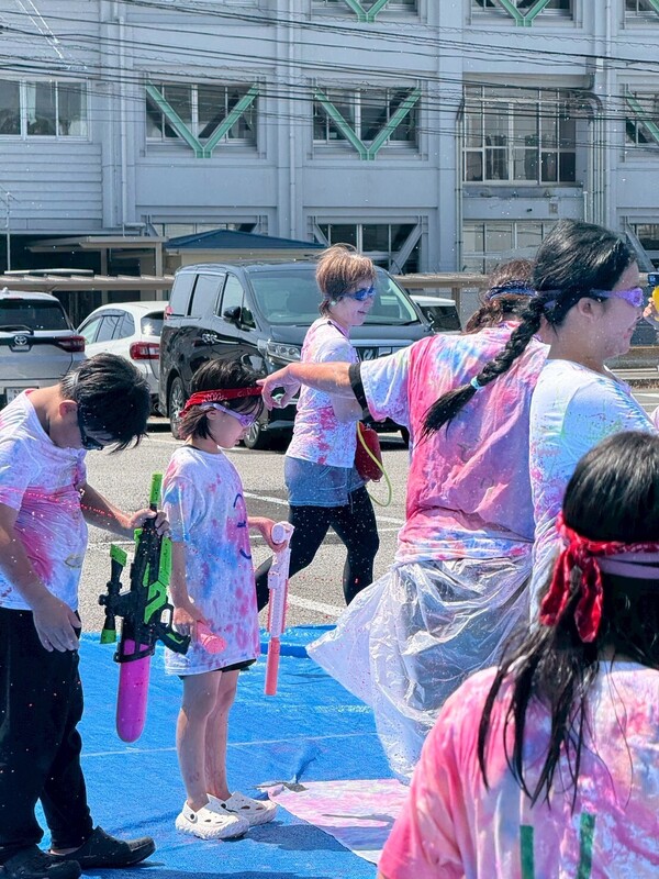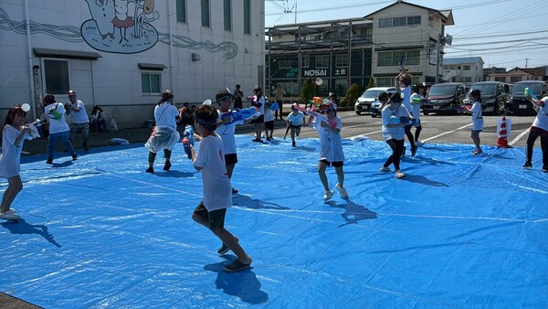 南国市子ども会連合会第9回どき・わくアドベンチャー大会が市役所北駐車場で行われました。令和6年度からは高知市大津子ども会も交流参加し、昨年以上の人数で大歓声の中、子ども達は楽しそうに水の掛け合いを行っていました。