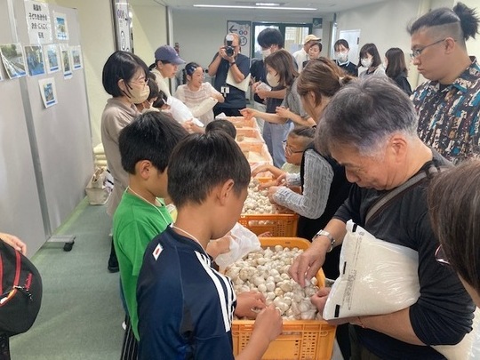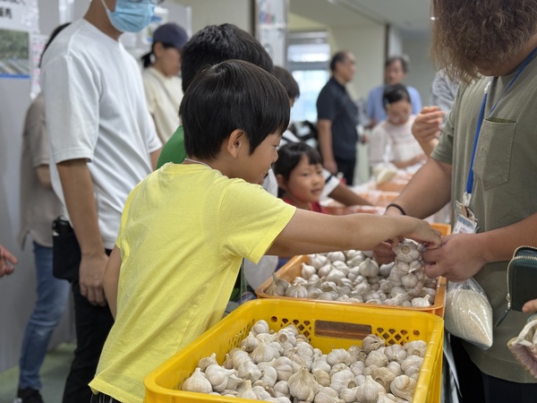 当日は山本会長の畑で収穫した無農薬有機栽培の「嘉定紫」のにんにく、稲生地区の橋詰昌明さんの水田で収穫した「よさ恋美人」の販売を市役所ロビーで行いました。参加した親子の中には、初めての体験に戸惑いながらも楽しそうに詰め放題やすくい取りを勧めていました。職員の方々を中心に多くの方が販売に協力してくれました。
