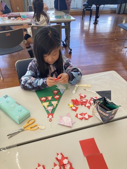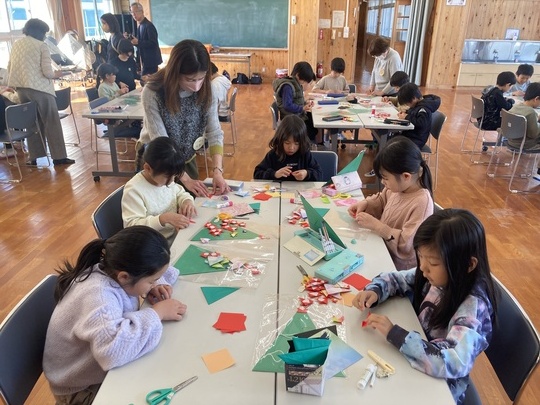 12/11南国市更生保護女性会久礼田・国府地区会員によるクリスマスツリー作り(久礼田小学校) トップページ - 12/11南国市更生保護女性会久礼田・国府地区会員によるクリスマスツリー作り(久礼田小学校) ページID:9750担当 : 生涯学習課掲載日 : 2025/12/19 南国市更生保護女性会の久礼田・国府地区会員による折り紙を使ったクリスマスツリー作りが、小学校2・3年生35名と保護者の方が参加して久礼田小学校で行われました。参加した子ども達は、折り紙に夢中になって取り組んでいました。保護者の方の中には、家で折り紙を親子で折ったりする方もいて、上手に出来たクリスマスツリーを見て子ども達はみんな喜んでいました。 【お問い合わせ先】 南国市少年育成センター 電話088-863-4201