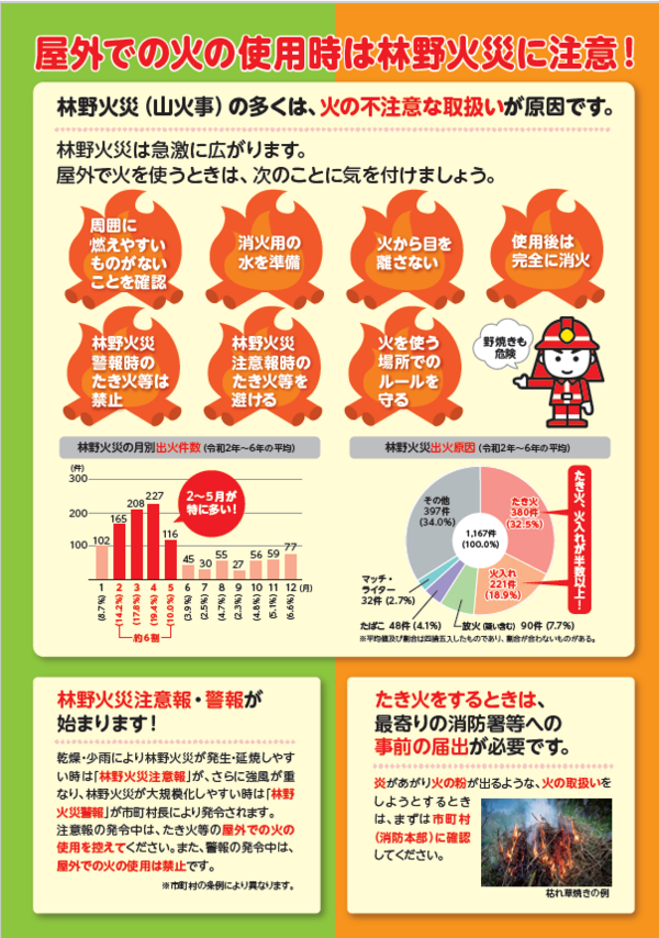 山仕事等で野山に入られる方、森林のそばで農作業及び工事等を行っている皆様、野外での火の取り扱いには十分ご注意いただき、林野火災の防止についてご協力をお願いいたします。
