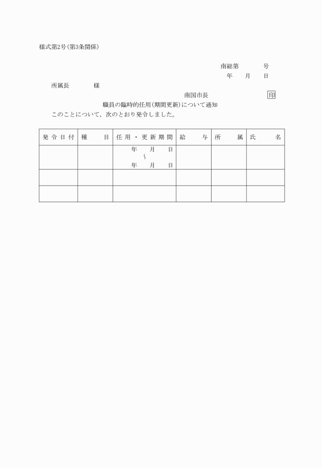 3 臨時的任用をしたときは,当該課長(課長に準ずる者を含む。以下「所属長」という。)に対して通知書(様式第2号)を交付しなければならない。