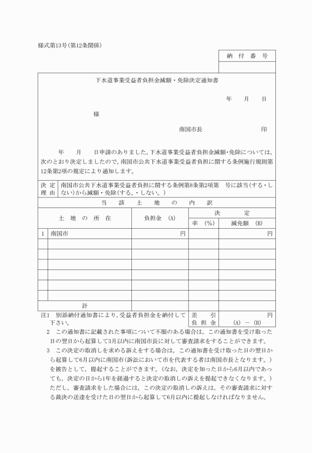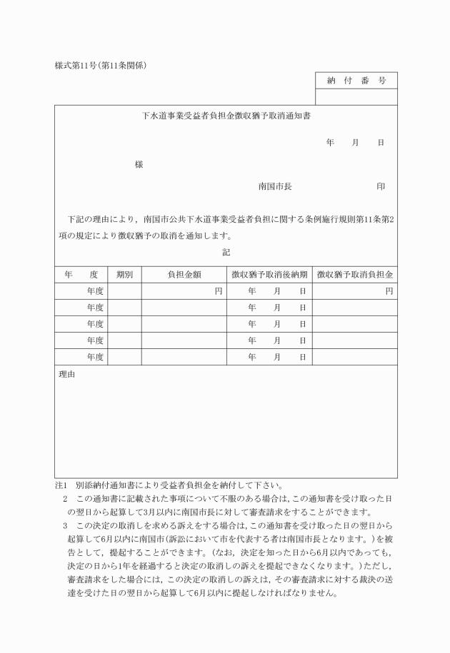 3 市長は,受益者の変更があった場合は,当該変更により納付義務が消滅した負担金の部分を,下水道事業受益者負担金納付義務消滅通知書(様式第18号)により旧受益者に通知するものとする。