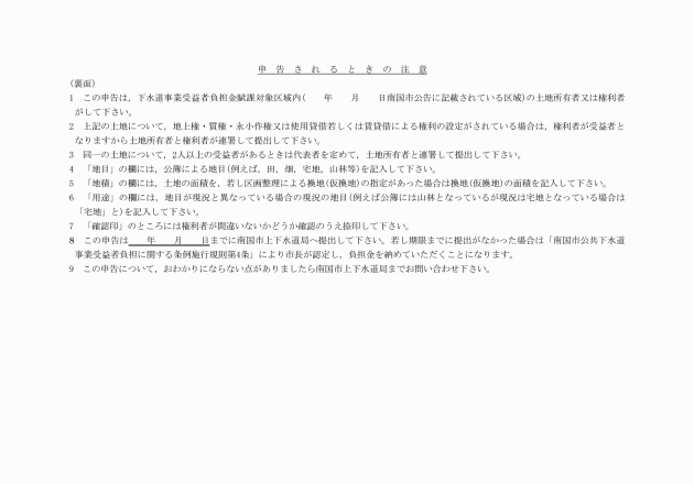 第3条 受益者は,条例第4条の規定による賦課対象区域の公告の日以後市長の定める日までに下水道事業受益者申告書(様式第1号)を市長に提出しなければならない。この場合において,受益者が条例第2条第1項ただし書の規定による地上権者,質権者,永小作権者,使用借主又は賃借人であるときは,土地の所有者と連署しなければならない。