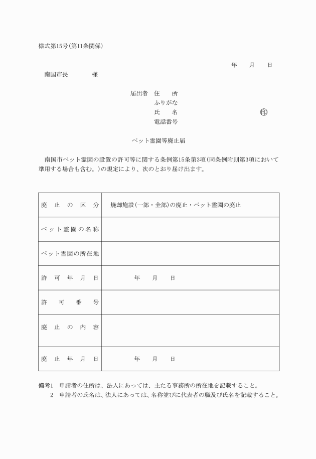 ○南国市ペット霊園の設置の許可等に関する条例施行規則