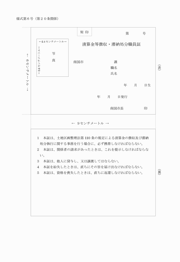 第20条 清算金及び延滞金を徴収する職員が徴収事務に従事する場合又は滞納処分を行う場合は,清算金等徴収滞納処分職員証(様式第6号)を携帯し,関係者の請求があったときは,これを提示しなければならない。