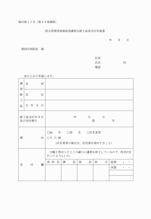 第28条 消防長は,修了証を紛失し,汚損し,又は破損した者から再交付の申請があったときは,防火管理者資格取得講習会修了証再交付申請書(様式第17号)を提出させるものとする。
