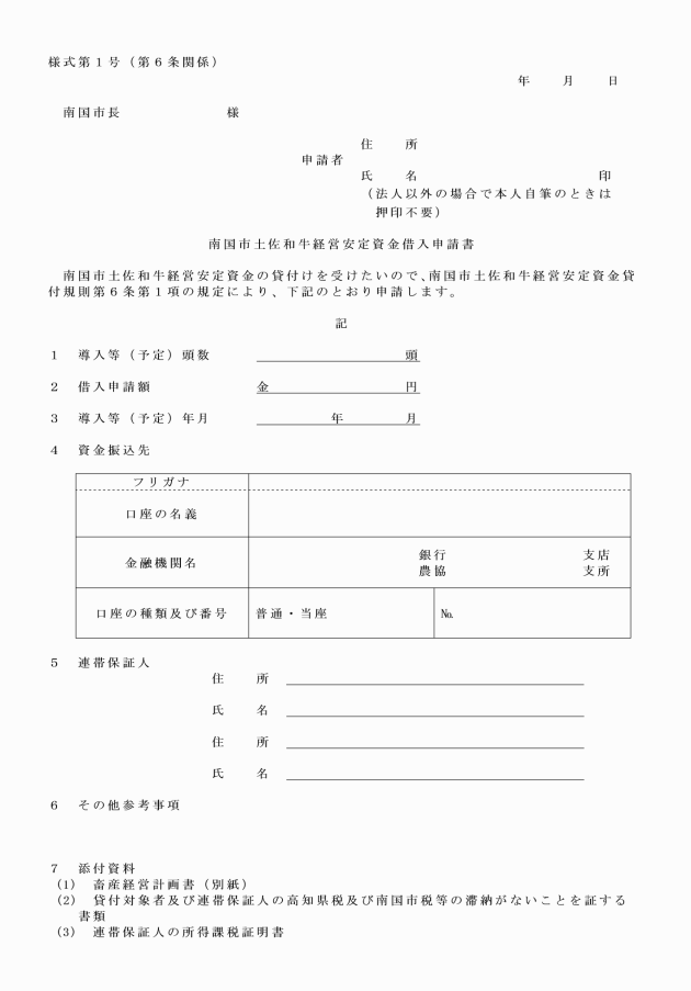 第6条 貸付対象者は,資金の貸付けを受けようとする場合は,南国市土佐和牛経営安定資金借入申請書(様式第1号)に次に掲げる書類を添えて,市長に提出しなければならない。
